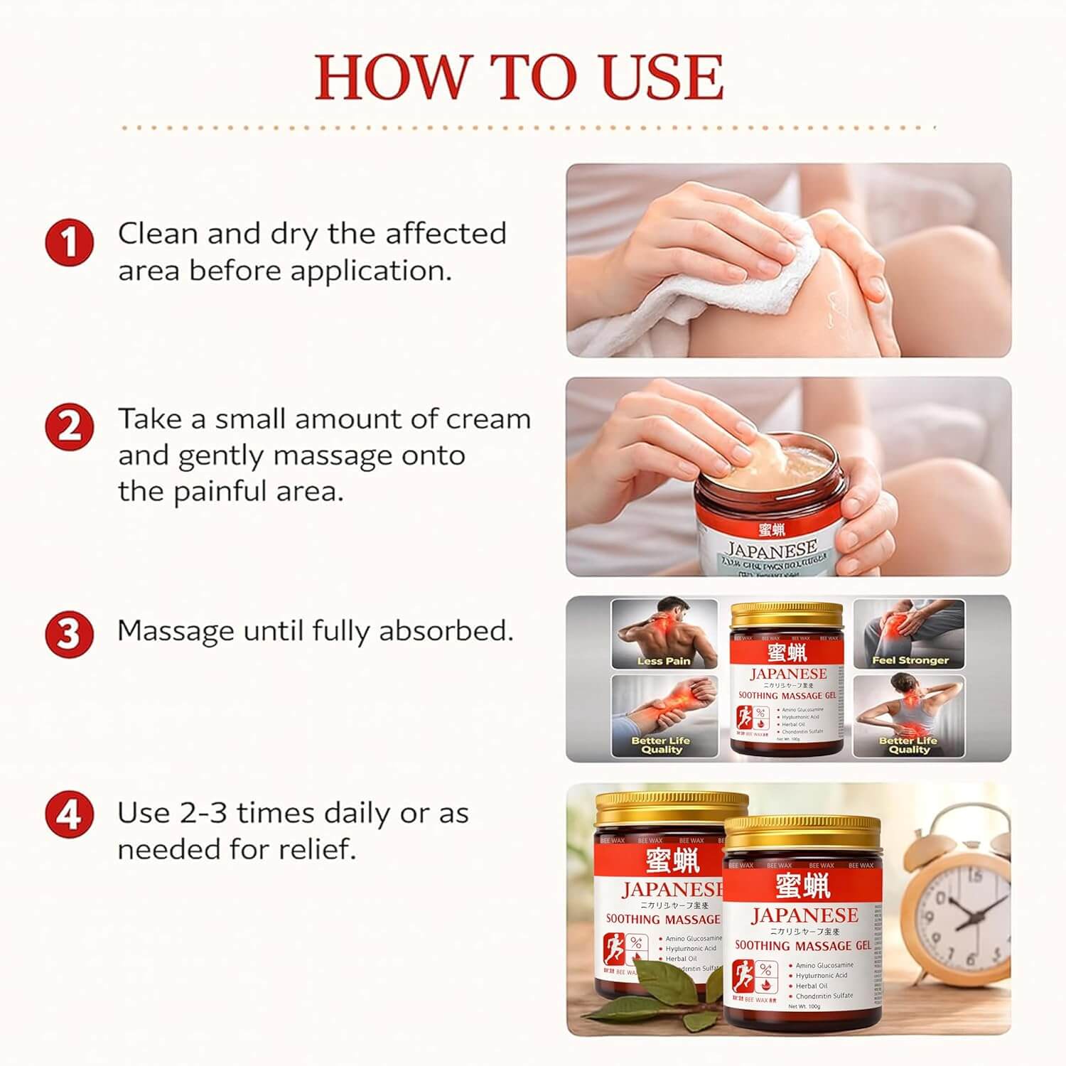 ✔️ Japanese Formula – Unique blend of Arnica, Mugwort & Hyaluronic Acid crafted with ancient Japanese wisdom for deep relief and nourishment.